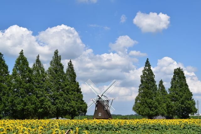 風車をバックにしたひまわり畑からレジャーで人気のスポットまで