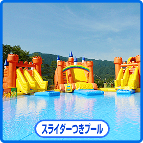 スライダーつきプール、キッズパドリングプール、6mチャンレジスライダー、キッズ用浮き輪スライダー、などの6つのプールと噴水コーナーや、飲食やシャワーまで揃っているのでご家族で楽しめそうですね。