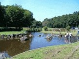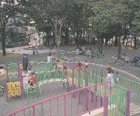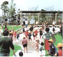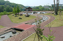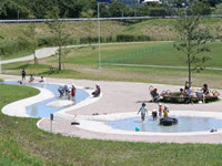 こちらのじゃぶじゃぶ池は、夏場に水が入り、40mにも及ぶ水深5cmの「せせらぎ」と、直径22m、水深15cmの「親水池」があります。水深が浅いので、幼児でも安心して遊べます。