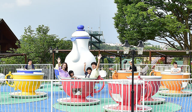 園内には、かわいらしい観覧車、ファミリーコースター、メリーゴーランド、コーヒーカップなど小さい子ども向けのアトラクションが並びます。