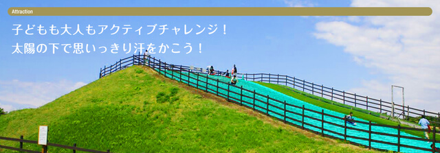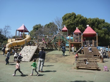 とても広い「平塚のはらっぱ」や、「わんぱく広場」にはアスレチックやローラーすべり台があり、お弁当を持って楽しむ家族でにぎわっています。
