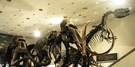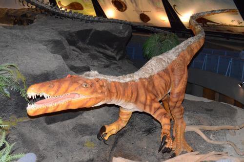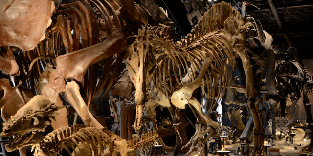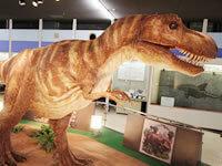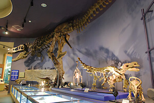 なんといってもそれを取り囲むように陳列された、全長11メートルのティラノサウルスの全身骨格は圧巻です。このほか、トリケラトプスの角や、プテラノドン、エオラプトルの全身骨格なども見ることができます。