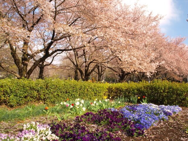 広大な芝生でのんびりお花見を楽しむのもよし、公園内の桜並木をベビーカーでゆっくりお散歩するのもおすすめですよ。