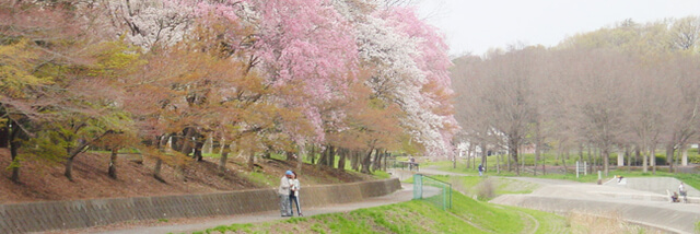 公園沿いの遊歩道(桜土手)に4kmにわたってソメイヨシノが咲きます。並木道を桜色に彩るのがとてもきれいで、お散歩をしているだけでも楽しめますよ。