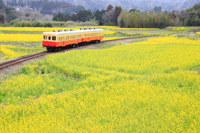 小湊鉄道では、10年ほど前から、沿線10か所以上で地域の方々と小中学生などの方々が、秋に菜の花の種をまき育てています。種をまく場所は、絵になる場所を選んでいるので、3月中旬から4月中旬には大変多くの菜の花が咲き乱れ、鉄道との共演はとても絵になります。