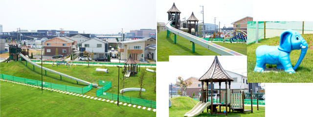 その巨大遊具は広い芝生広場の横、「こどもあそびひろば」にあります。ロングすべり台にコンビネーション遊具、ラダー遊具など、傾斜のある地形をうまく使ったアスレチック遊具は子どもが夢中になりそう。
