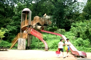 遊具も木を使った素朴でしっかりした造りのフィールドアスレチックで、森林浴をしながらのんびり遊べます。