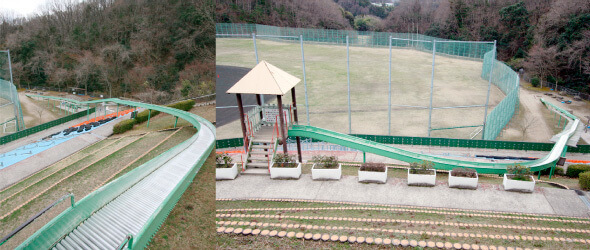 滑るところまで階段で登ることもできますが、岩のステップを登っていくこともできます。そして公園の一番端にあるのが「高石児童遊技場」。