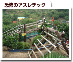 山の斜面を利用して作られたアスレチック「わんぱく坂」は大人でも体力のいる長さで、さまざまな仕掛けに子どもたちは大喜びです。