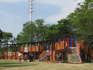 出典:www.osaka-park.or.jp無料レンタル自転車もあるくらいのとっても広い緑地で、3つの大型遊具・アスレチックが緑地に点在しています。まずは駐車場から一番近い「冒険ランド」。