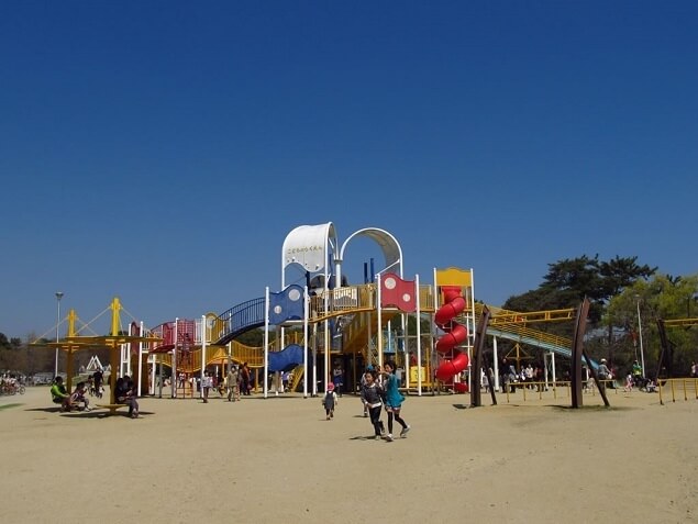 出典:www.city.higashiosaka.lg.jp東大阪一の規模を誇る公園で、乳幼児から小学生まで幅広く遊べる遊具が充実、一日中いても飽きません。 隣にある花園ラグビー場をイメージして、ラグビーボールのような大型の複合遊具がユニーク。