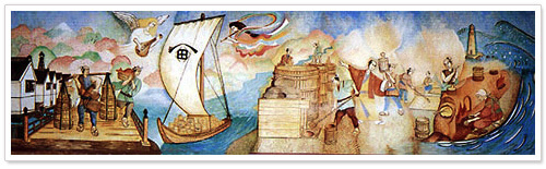 フレスコ画とは、砂と石灰を混ぜた漆喰で壁を塗り、その上から粉の顔料で描かれた絵のことで、創業385年の記念事業として制作されたものです。幅10m・高さ2.8mのサイズは大迫力ですよ。