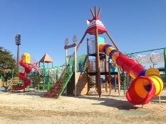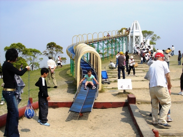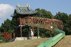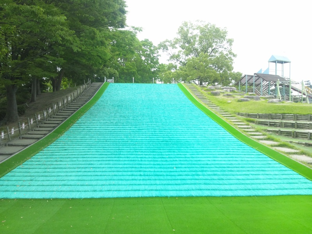 この公園にあるローラー滑り台は、角度がとても緩やかなため途中で勢いがなくなり止まってしまいます。途中からは、両手で端を持ちながら滑るのがコツのようです。