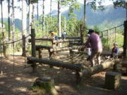 「冒険とりで」には山の斜面を利用して作られた、様々な種類のアスレチックが充実しています。 丸太やネットなどを駆使したアスレチック遊具は、全身の体を使って遊べます。