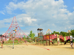 芝生広場横にある「わんぱく広場」にはカラフルなコンビネーション遊具がたくさんあります。25種類の遊具で遊べるので、お子さんもお気に入りの遊びを発見できることでしょう。