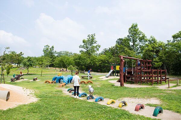 芝生もきれいで木々も多く新緑や気候の良い時期は、とても気持ちがよくおすすめです。「芝生の広場・森の遊び場」には、滑り台やタイヤなどを組み合わせた木製のアスレチック遊具が種類豊富にあります。