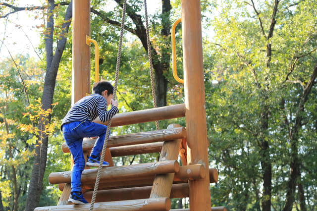 丸太渡り、壁登り、ネットくぐり、ターザンロープなど難易度の高いものもあれば、幼児も大人と一緒に楽しめるものもありますよ。大人も一緒になって夢中で遊べそうです。
