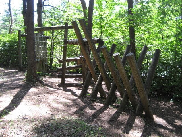 さらに奥へと進むと、無料で遊べるフィールドアスレチックで楽しめます。2016年4月にリニューアルされ、2種類のアスレチックロードと全長20メートルもあるスカイロープができました。