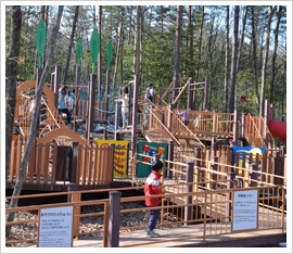 恐竜は、中に入ることができたり、遊具になっていたりするものもあり、子どもたちは夢中になって遊んでいます。フィールドアスレチックコースは、「冒険の森」にあります。