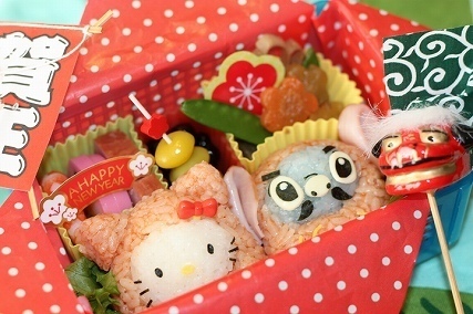 お正月に作ったお弁当で、キティちゃんに被り物をさせたおにぎりです。