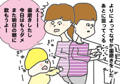 この時は、大泣きな状態のまま強引にベッドに引きずり込んで寝かしつけをする大変さと、歯磨きをもう一度する大変さを天秤にかけたら・・・歯磨きを選んじゃいました・・・。