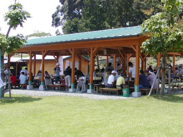 緑が気持ちのいいバーベキュー場には屋根があるので、雨でもできますよ。