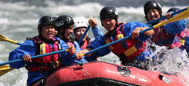 本物の激流をうまく下るには、一緒にボートに乗っている家族や仲間たちと力を合わせて一致団結することが大事。