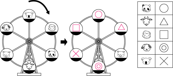 「観覧車」の問題の場合、「並び順」と「回転」の両方を気にしなければいけません。複雑そうに感じた時こそ、シンプルに順序良く考えていくことが大事ですね。
