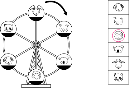 2.「パンダさんが一番下まで動いたとき、今ブタさんがいる場所に来る動物」とは、