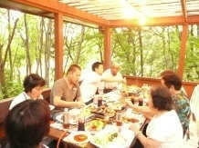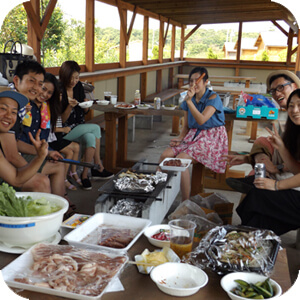 バーベキューハウスは屋根があり、雨でも安心。炉を囲むようにベンチが設置されているのがうれしいですね。食材は持ち込んでもOKですし、予算に応じて用意してもらうことも可能です。