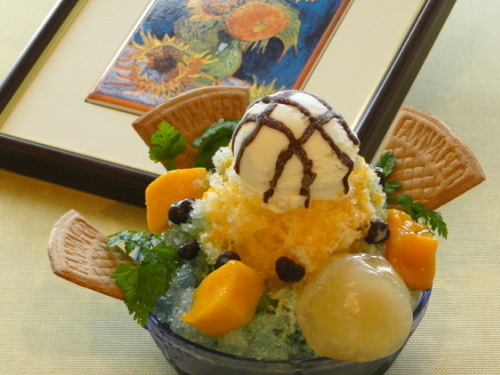 そして、この「ヒマワリ事件簿」に登場する、ゴッホの幻の「ヒマワリ」がかき氷になって、館内のカフェにて販売されています。