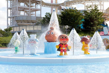 波のプールに流れるプールなど色々ありますが、それいけ!アンパンマンプールは、ふわふわのすべり台があったり、噴水があったりと、まだプールに慣れていない子どもでも楽しめる遊具がたくさんあります。