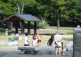 水深も浅くて、冷たくて気持ちのいい「河原遊び場」は、夏になると遊ぶ子どもがたくさんです。人工の小川や池があり、春から秋にかけて新緑や紅葉も楽しめる”せせらぎと木漏れ日”の水辺広場となっています。
