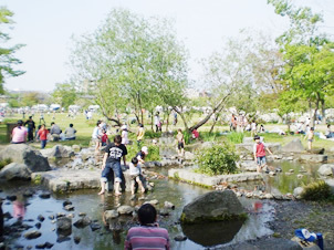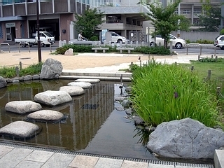 小川も流れていてとっても風情のある公園で、飛び石もあります。水で思いっきり遊びたい子どもには物足りないかと思いますが夏の暑い日に水辺で涼むにはぴったりの公園です。