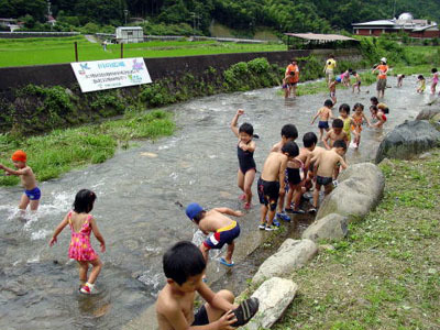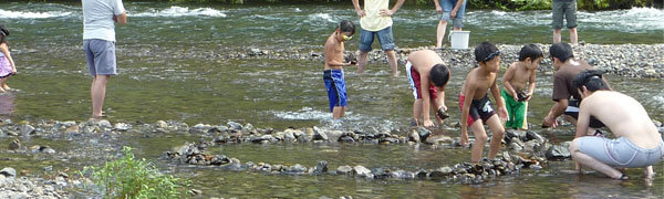 自然体験では実際に川に入って鮎の手づかみが出来たり、河原での水遊びもできたりします。川は危険ですので子どもは必ずライフジャケットを着用して、目を離さないようにしましょうね。