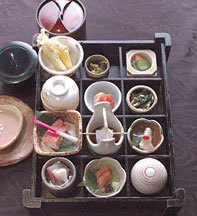 定番メニューの「つつうらうら ささ川伝統の一式」は、女性好みの少量多品種で、小鉢がずらりと並びます。
