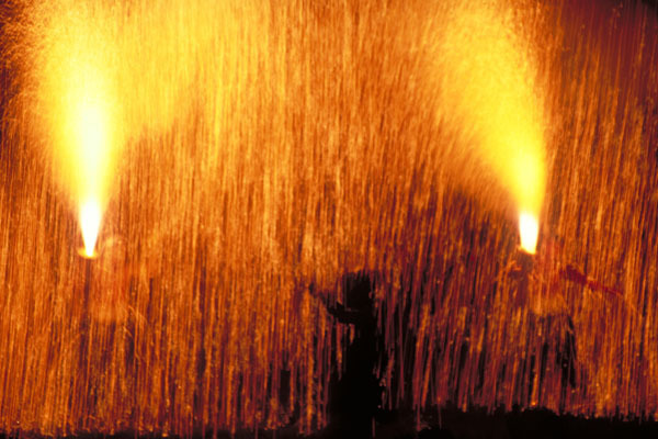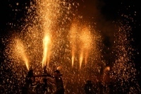 50本の手筒花火も圧巻です。まるで火の粉が降り注ぐように赤く吹き上げる手筒花火。その姿を見ているとなんだか夏の暑さも吹き飛んでしまいそうです。