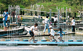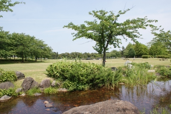 多目的芝生広場の周りに広がる修景池では、夏に水遊びを楽しむ子ども達でいっぱいです。
