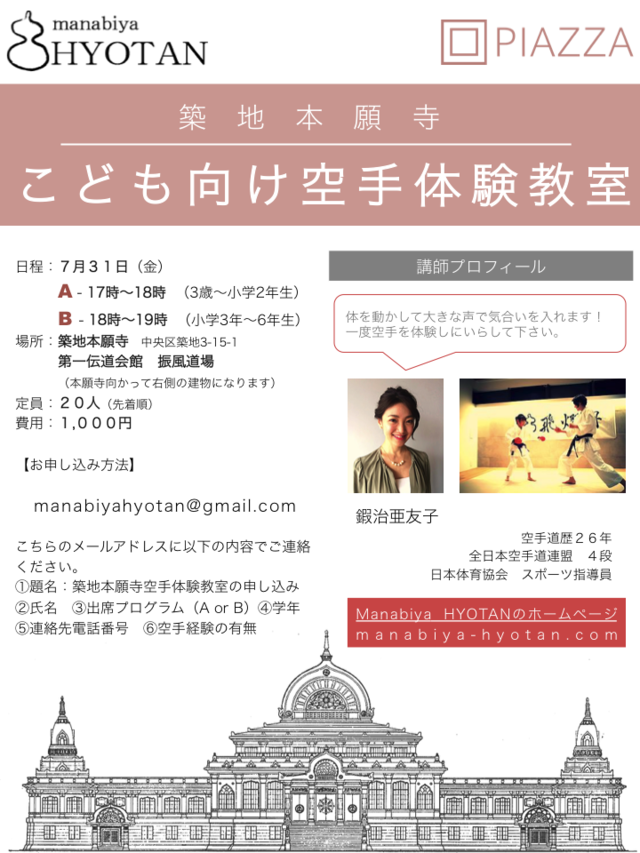 築地本願寺という清い場所で本格的な空手体験教室(3歳から小学生6年生が対象)になります。ご興味があれば、気軽にお申し込みくださいね!
