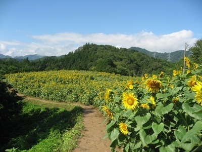 お天気の日には、独鈷山を背景にして、このひまわり畑が広がり、なかなか壮観な光景が見られます。