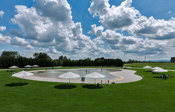 池の中央から涼やかに水が湧き出し、夏場は多くの子ども達で賑わいます。モエレ沼公園の広大な敷地には、ゆるやかな山や噴水、遊具などが点在します。