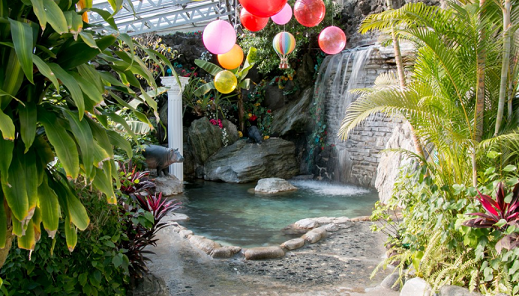 ジャングルスパ「Pau」は、熱川唯一のジャングルスパ。南国を思わせる木々があたりに茂り、その中には「超リアル」な動物フィギュアがお出迎え。