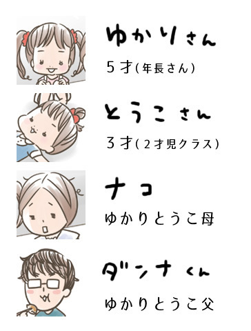 ゆかりさん(5才年長さん)、とうこさん(3才)、その母(私)、ダンナ君の4人家族の日常をマンガなどで綴っています。