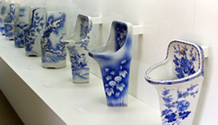 ただその展示内容は多くの来場者を予想外に驚かせるものです。白い陶磁器に青い染料で染めつけされた「染付古便器」は、一見して花瓶や骨とう品の壺などを思わせるような外見。