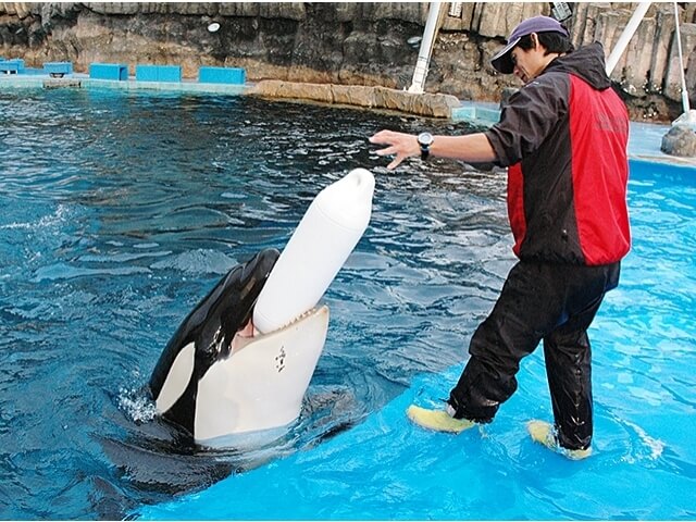 そんな力強い姿を見せるシャチなんですが、飼育員さんの前で器用におもちゃをくわえたり芸を見せる様子は、ギャップと相まってとてもかわいらしく見えてしまいます。