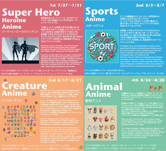 英語で「アニメ」を学ぶ、ということを軸に、サマースクールの為だけに開発された特別プログラム。ターム毎に異なるテーマが設定されており、4ターム全てを申し込まれたとしても、楽しみながら学ぶことができます。