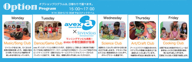 出典:www.7sis.jpサマースクール自体は14時半に終了しますが、14時半以降のオプションプログラムとして、音楽やダンス、科学、工作など日替わりで17時までのメニューを用意しています。