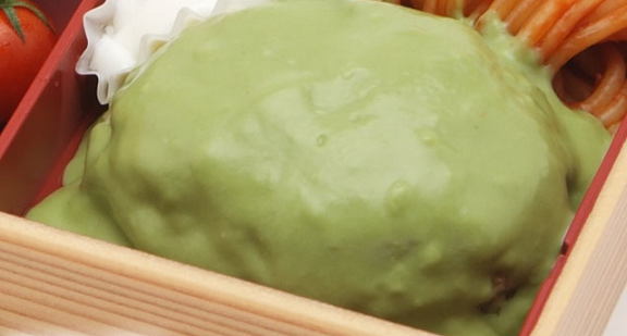 れんが亭の大注目創作メニューが「抹茶香る西尾ハンバーグ」です。一目見たら忘れられないインパクト。