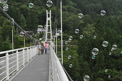 土・日・祝日に、シャボン玉が吊り橋の上を舞い、幻想的な景色が楽しめます。ロマンチックな写真を吊り橋の上で撮影してみてはいかが。