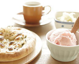 こちらのカフェではピザやホットドッグなどを、テラスで風感じながらいただくのがおすすめ。ジェラートは毎日作っていて、日替わりで色々なメニューがあります。